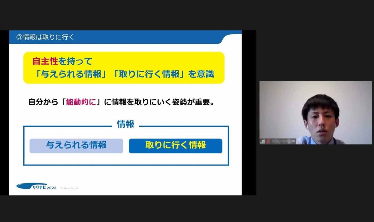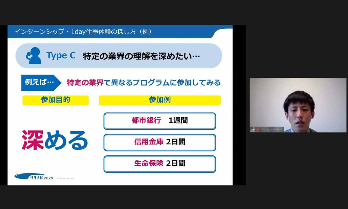 福井氏は、「企業の約95%がインターンシップを開催しています。新型コロナウイルス感染症拡大防止の観点から企業は学生との接点が減っており、対面で活動できるインターンシップは今まで以上に重要視されています。実際に体験しなければ分からない情報を集めることもできるので、積極的に参加してみてください。異なる業界のプログラムに参加して視野を広げたり、特定の業界の中で異なる企業のプログラムに参加して理解を深めたりと、自分の目的に応じた方法を探してみてください」と話しました。