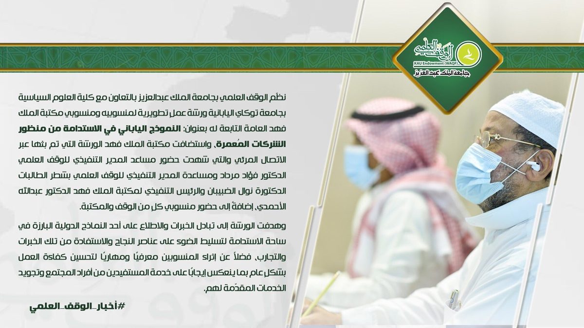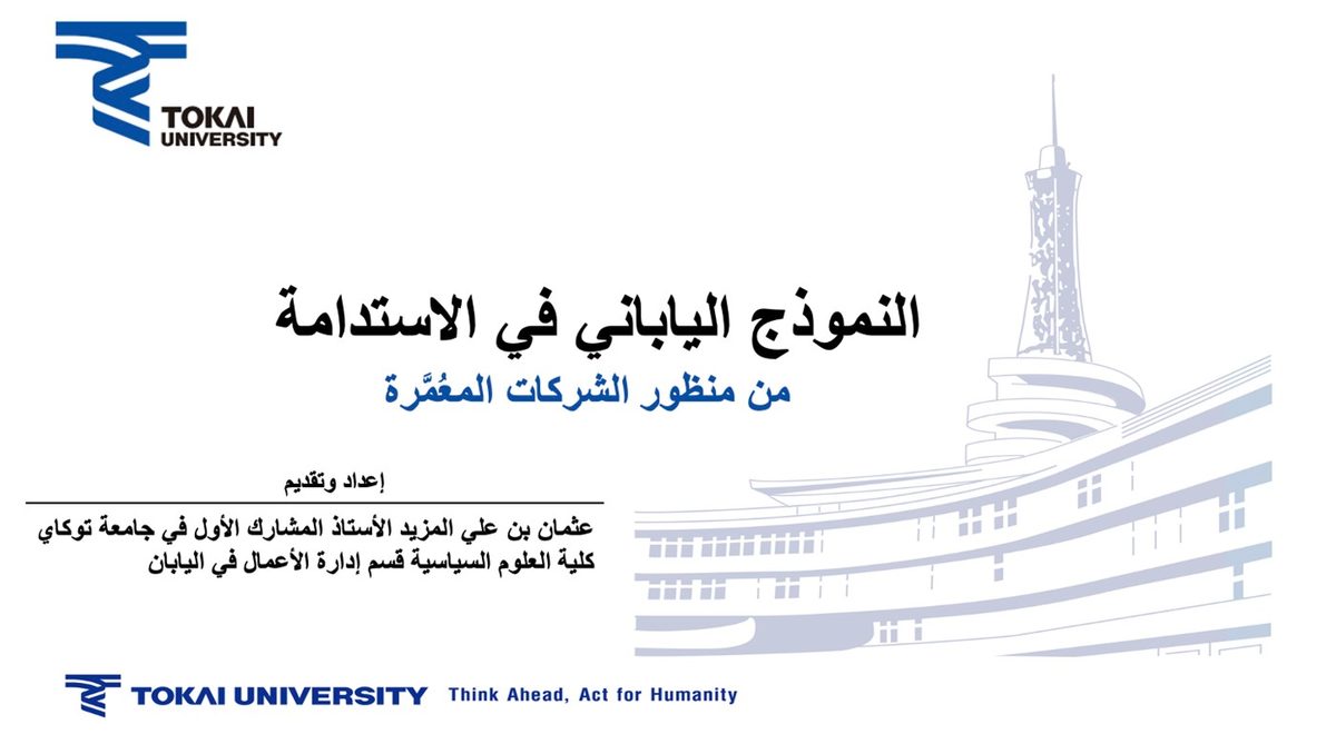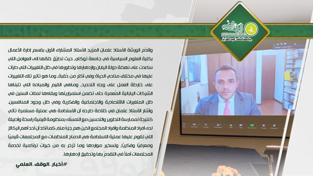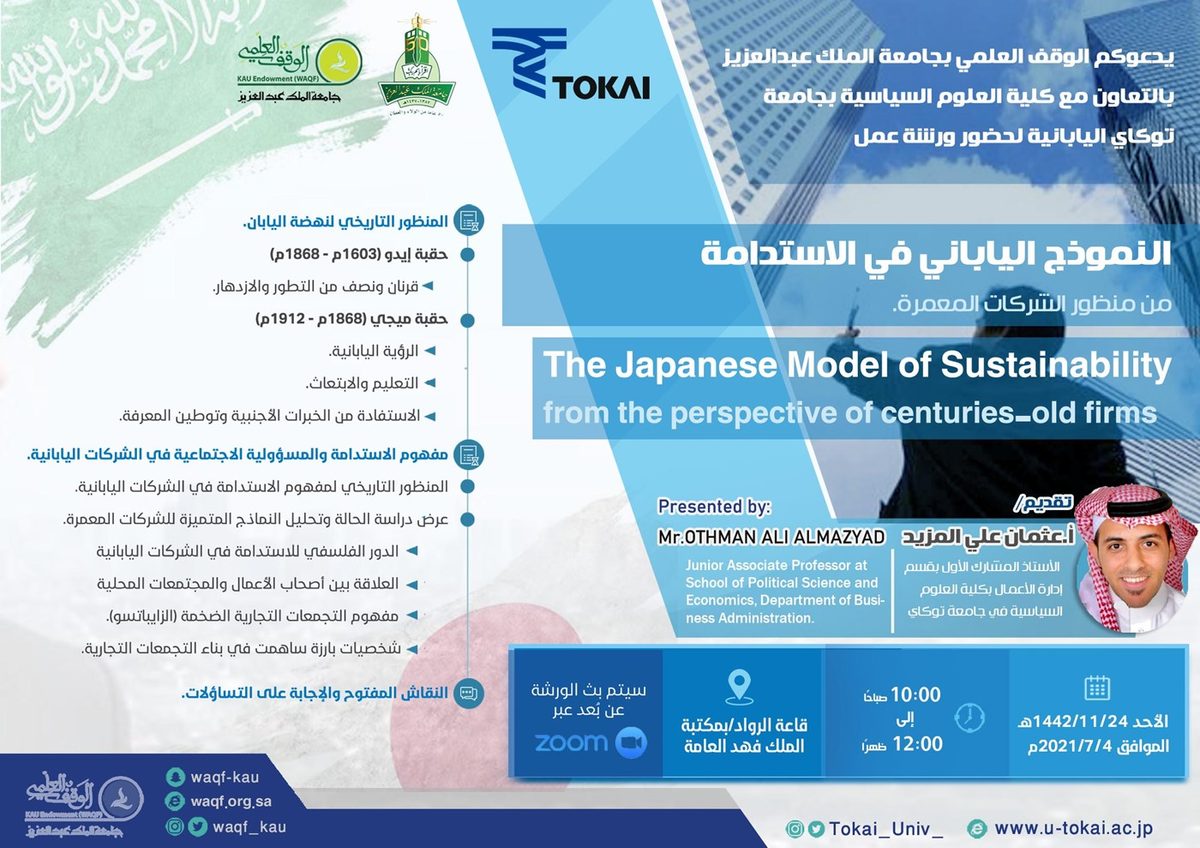 政治経済学部経営学科のアルマズヤッド・オスマン講師が7月4日に、サウジアラビアのキング・アブドゥルアジーズ大学(KAU)で行われたオンライン講演会で講師を務めました。KAUと本学は2010年度に教育研究に関する大学間協定を締結し、ソーラー無人飛行機の共同研究を進めるなど教員や学生の交流を図ってきました。今回は、オスマン講師の研究や論文に興味を持ったKAU科学基金(Scientific Endowment)の関係者から学術交流の一環としてとして講師の依頼があり、教職員ら約100名が参加しました。