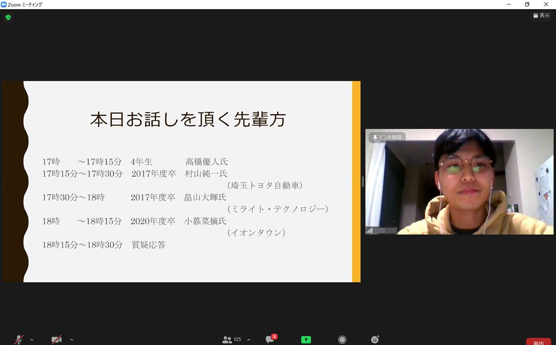 当日は4年次生1名と卒業生3名が登壇し、自身の就職活動の進め方や反省点、社会人の視点でのアドバイスなどを語りました。4年次生の高橋優人さんは、コロナ禍での就職活動の経験から、リモート主体のメリット、デメリットなどを提示。WEB面接の際のカメラの映り込みに気をつけるなど、具体的なアドバイスを話しました。続いて、村山純一さん(2017年度卒・埼玉トヨタ自動車)は、事前準備の重要性を指摘するとともに、面接では話すことを丸暗記せず、自分の言葉で語ることが大切であると語りました。畠山大輝さん(同・ミライト・テクノロジー)は、社会人として新入社員のコーチングをする立場から、就業時のイメージをつかむとともに、事前にコネクションをつくることで入社後もスムーズに仕事ができるため、OB・OG訪問を積極的に取り入れることの重要性を話しました。小暮菜摘さん(2020年度卒・イオンタウン)は自身の就職活動のスケジュールを表で示し、全体の流れについて説明しつつ、やっておいてよかったこと、もっとやっておけばよかったことを具体的に話しました。