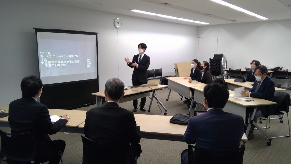 政治経済学部経済学科の大熊一寛教授のゼミナールでは、2月13日に平塚市役所を訪問し、地域における太陽光発電政策に関する調査研究の結果を発表しました。ゼミの活動として行った調査研究の成果を、行政の担当の方に報告し、意見交換をすることが目的です。