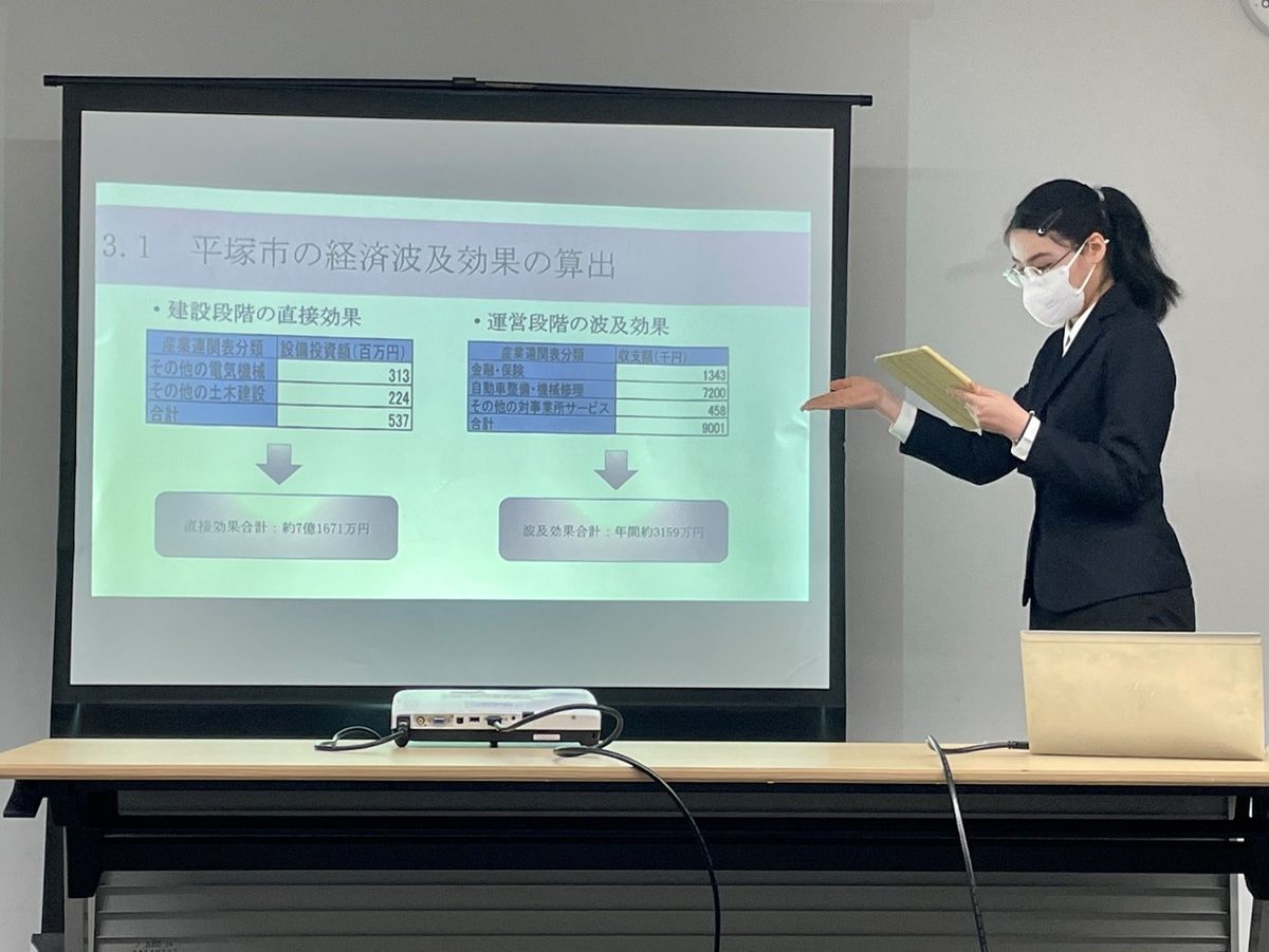 ゼミでは、班ごとに1年間をかけて調査研究を進め、報告論文を取りまとめました。地域の問題を研究する班では、平塚市と小田原市のカーボンニュートラルに向けた政策について調査研究を行いました。最新の政策動向を調査するとともに、太陽光発電を導入した場合に地域経済にどのようなプラスの効果が起こるか(経済波及効果)を、産業連関分析の手法で推計し、比較して分析しました。その結果、平塚市は機械などの製造業の産業基盤が整っているため、太陽光発電事業から関連産業への波及効果によって、比較的大きい経済効果が期待できることが分かりました。