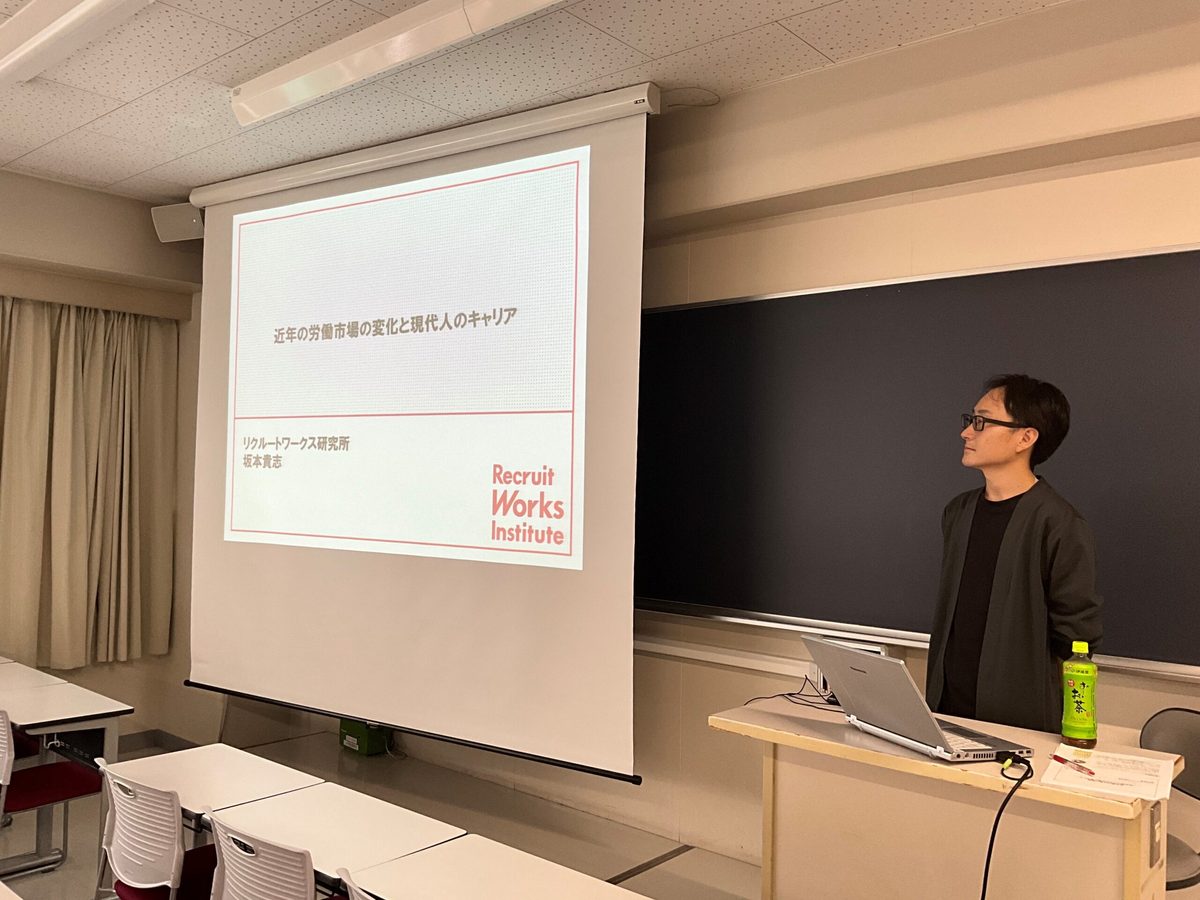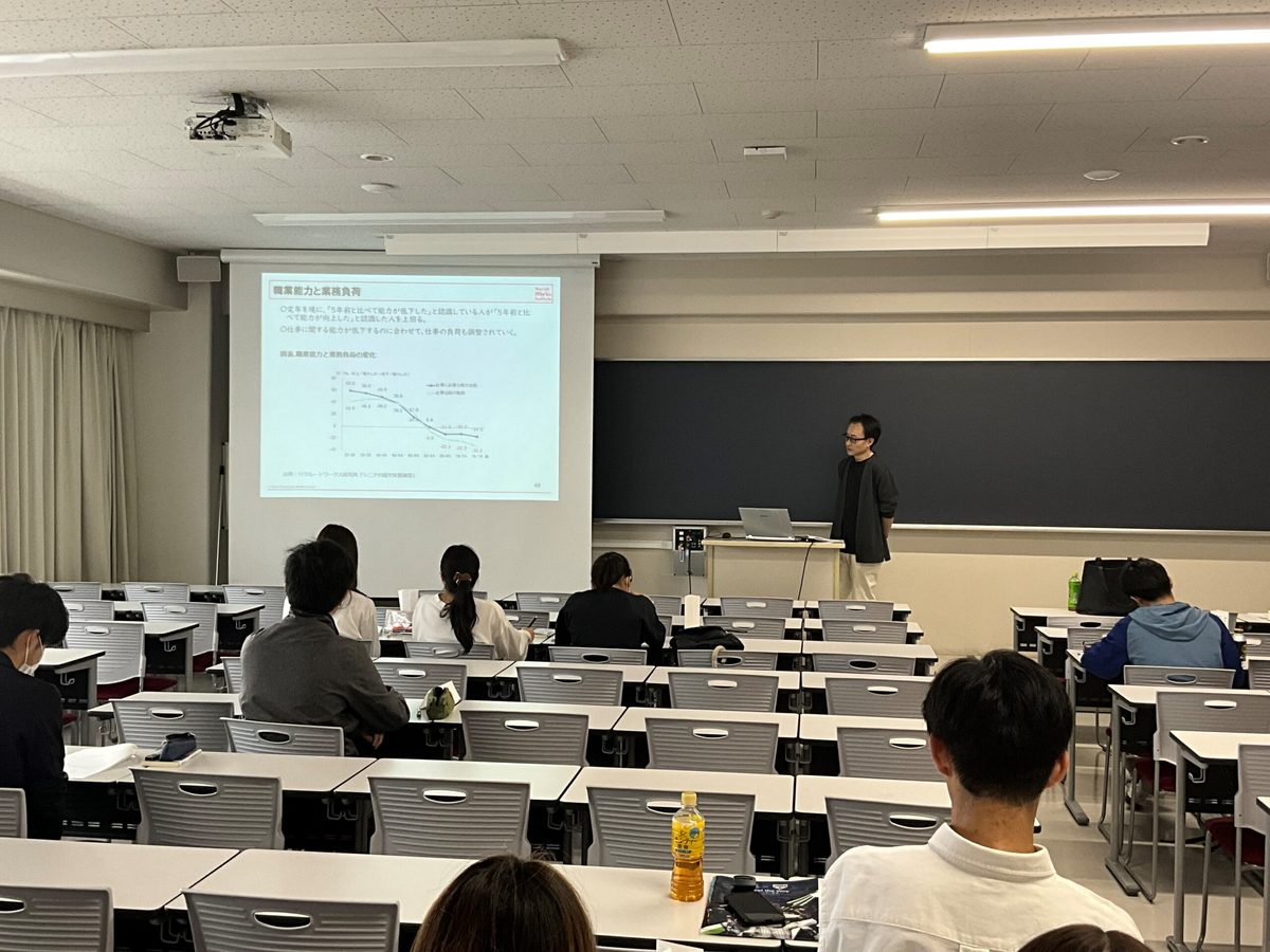 本日の講義では、人口減少に伴って近年の労働市場が大きく変化していることや、日本人のキャリアが長期化してきていることなどについて、豊富な統計データを用いて分かりやすく講演いただきました。学生たちからは、「統計データの説明から日本人の働き方が大きく変わってきていることがよく分かった」、「これから就職活動を控えているが、自分の職業選択をしていく上でも参考になる話を聞くことができた」といった感想が寄せられていました。