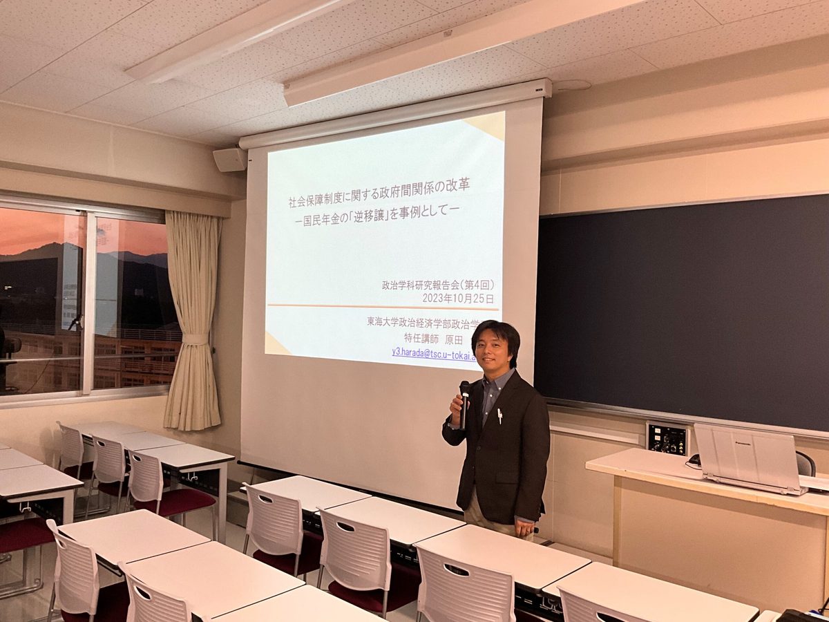 10月25日(水)に、今年度4回目の政治学科研究報告会が開催され、原田講師が「社会保障制度に関する政府間関係の改革-国民年金の「逆移譲」を事例として-」をテーマに研究報告を行いました。原田講師は、今年度から本学に着任した新任の教員です。行政学・公共政策学を専門とし、国家公務員としての勤務経験(厚生労働省・総務省)も活かしながら、社会保障制度を題材に中央地方関係の視点から研究をしています。これまでの研究では主に社会保障制度の中でも社会手当を題材にしてきましたが、今回の研究報告では、国民年金の「逆移譲」を事例として政府間関係の改革を論じるという新たな研究構想が報告されました。
