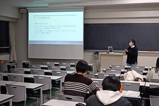 横浜市のNPO法人「アーモンドコミュニティネットワーク」で実習した小林愛歩さん(同)は、バリアフリーコンサートや映画上映会などを運営し、居場所が必要な子どもや要支援にあたる高齢者をサポートしました。「他の団体とも協力しながら事業を運営するなど、人と人とのつながりでNPOが成り立っていることがわかりました」と話しました。齊藤智大さん(同)は伊勢原市のNPO法人「イセハライク」で実習。「イセハライチ」をはじめとする地元商業の発展に向けたイベントを運営したものの、「来場者数が少なかった」と振り返り、「イベントの内容が知られていないことが原因。SNSを活用した情報発信が必要だと感じました」と語りました。小田原市のNPO法人「市民活動を支える会」でのインターンを体験した清水樹さん(同)は、「おだわら市民交流センターUMECO」で開かれた「風の会」や「UMECO祭り」などの運営に携わり、「車椅子を利用する方への配慮など、インクルーシブな社会を目指す上で必要な所作を学べました」と話しました。