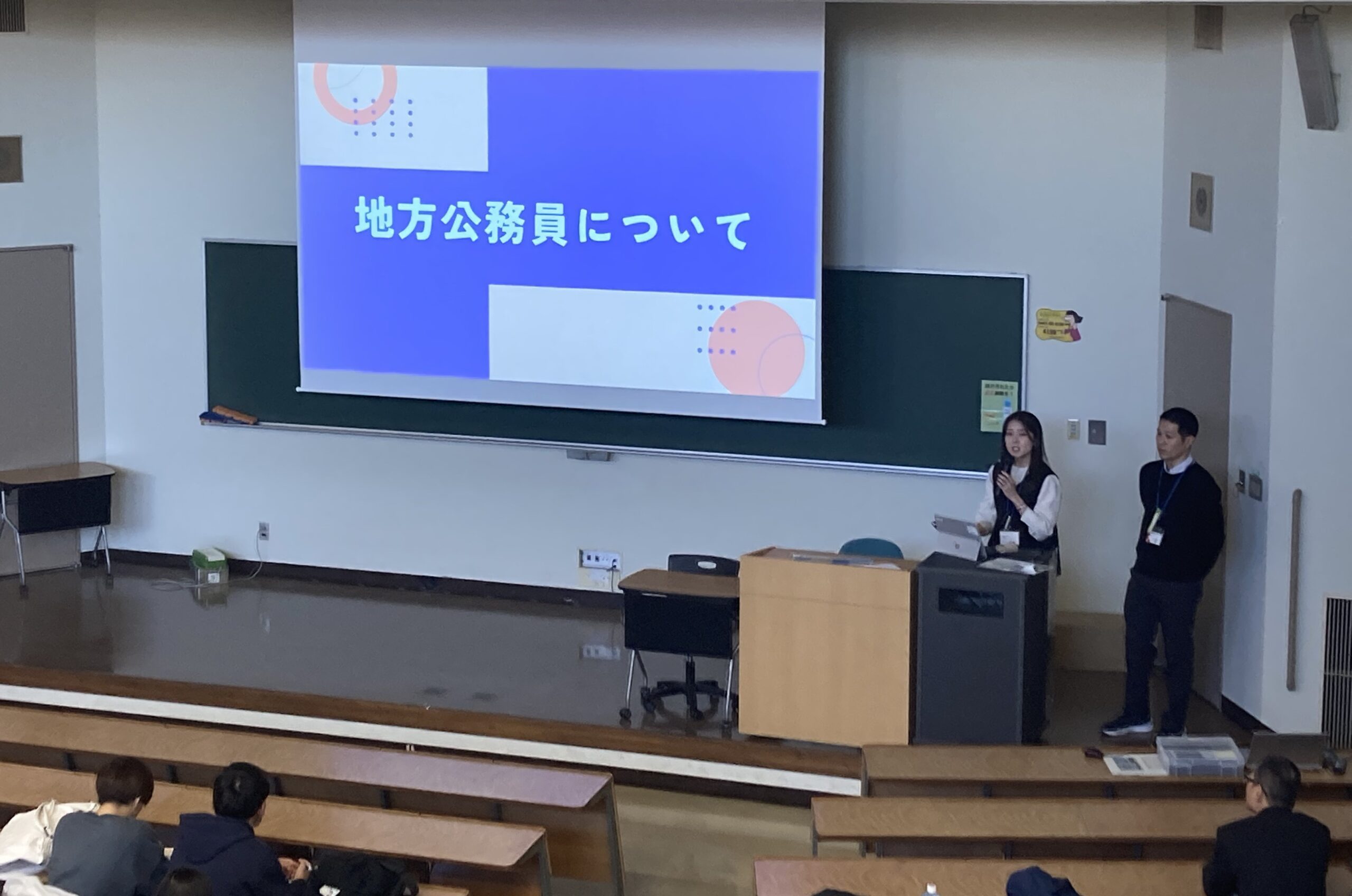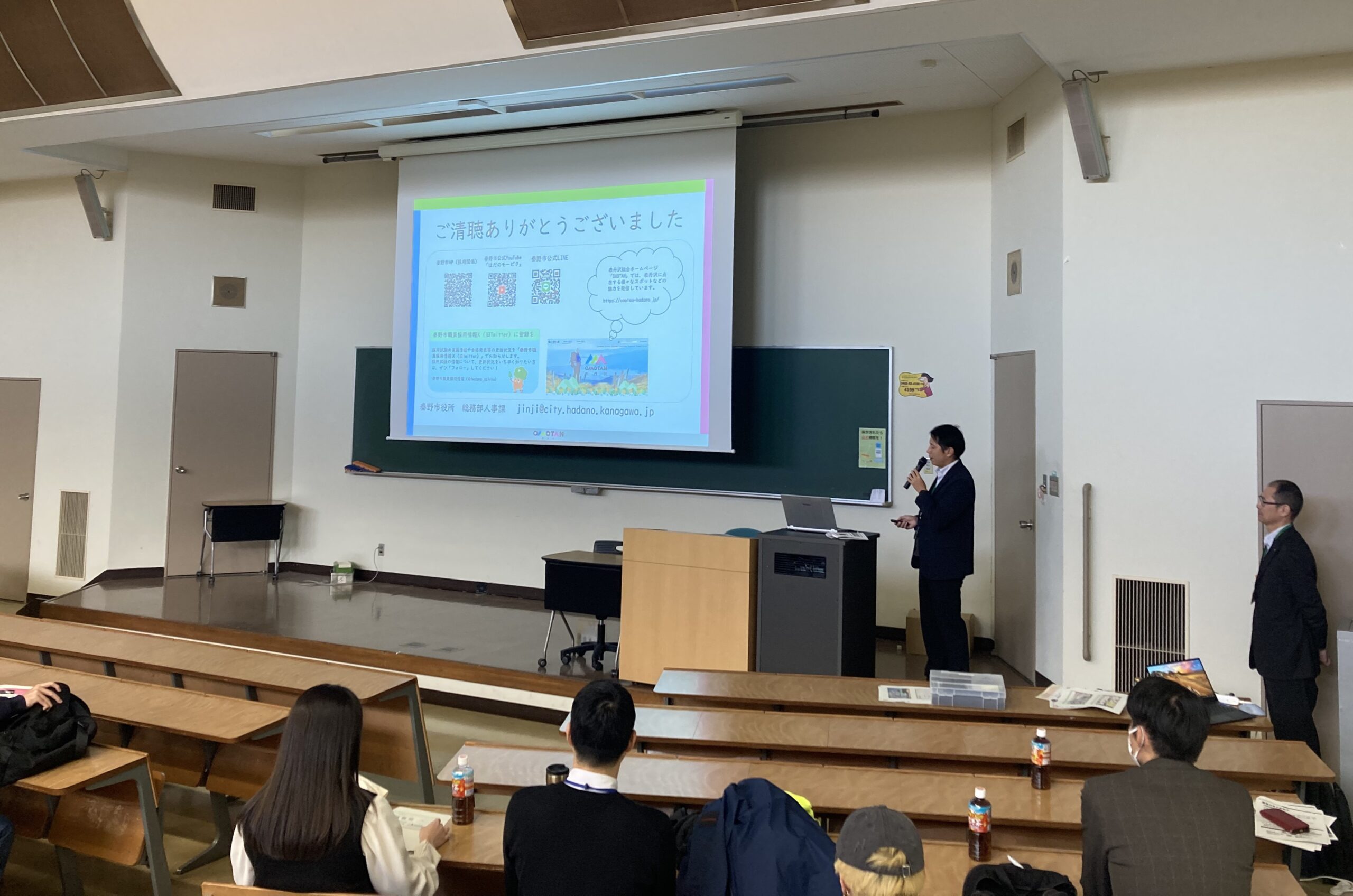 伊勢原市・秦野市はともに湘南キャンパスに隣接する自治体であり、常日頃から本学は様々な面で連携をさせていただいています。今回は学生たちのために計5名の職員の方々に来校いただき、それぞれの市の概要のほか、地方公務員の勤務条件、職務内容などについて説明いただきました。また、講演の中では、来校いただいた職員の方々のこれまでのキャリアについても具体的に紹介いただきました。学生たちからは、「講義を受ける前まで市役所職員のキャリアパスがどのようなものか知らなかったが、具体的なイメージを持てるようになった」、「ジョブローテーションを通じて幅広い業務に従事し、様々な経験を得ることができることが分かった」、「これまで漠然と地方公務員になりたいと考えていたが、伊勢原市・秦野市の職員の方々から具体的に話を聞くことができ、より一層興味が湧いた」、「採用試験が両市とも近年人物重視になっていると聞き、自分も目指してみようと思えた」といった感想が寄せられていました。
