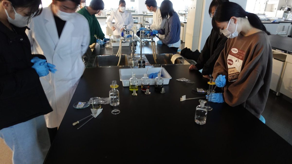 理学部化学科では、3年生の有機化学実験において自分でルミノールを合成して化学発光をおこなう実験があります。その他にもワクワクする実験を多数受講することができます。