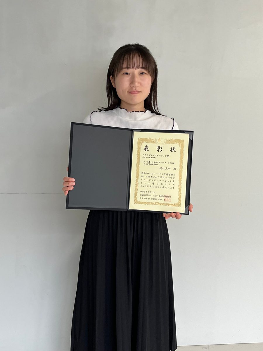 2023年8月31日-9月1日に富士交流プラザ(静岡県富士市)で開催された第36回におい・かおり環境学会において、理学研究科化学専攻の村松真歩さん(修士2年生)が「ヒト皮膚から放散するγ-ラクトンの性差および年齢依存性」と題してポスター形式で研究発表を行い、ベストプレゼンテーション賞に輝きました。