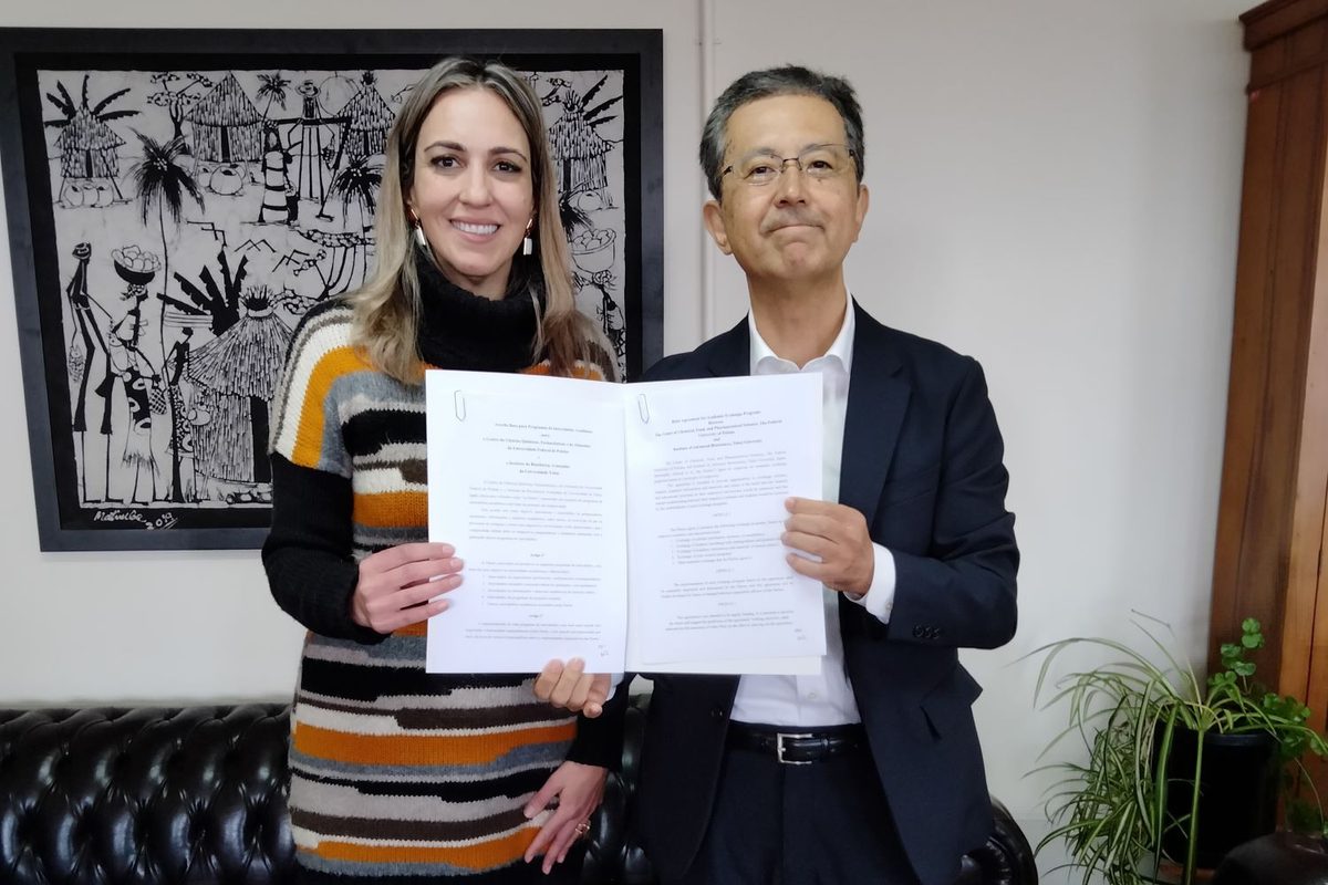 東海大学先進生命科学研究所ではこのほど、ブラジル・ペロタス連邦大学化学・食品・薬学センターと学術交流協定を締結。9月6日に同大学で締結式を行い、本研究所の岩岡道夫所長(理学部化学科教授)と同大学のイザベラ・フェルナンデス・アンドラーデ学長が協定書にサインを交わしました。ペロタス連邦大学は、ブラジル南部の都市ペロタスにある国立の総合大学です。今回の協定は、岩岡所長らが同センターと進めているセレン化合物に関する研究などの進展に向けて、さらなる協力関係を構築するために結んだものです。