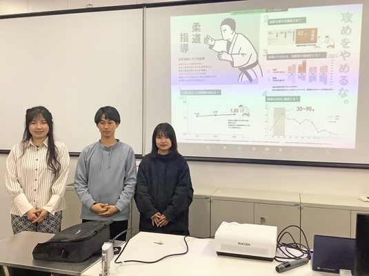 矢島さんは、「インフォグラフィックの作成は初めての経験だったので、本を読んだり、先生のアドバイスを聞いたりしながら取り組みました。二人が提示してくれたたくさんのデータをいかに選別して形にするかに苦労しましたが、オレンジをアクセントにして、分かりやすいレイアウトを心がけました」と振り返ります。加瀬さんは、「コロナの影響で制限の多い学生生活を送ってきたので、他学部の人と協力して何かに取り組む貴重な機会だと思い参加しました。“指導の現状を知り、新たな視点から柔道の試合をもう一歩深く見る”をコンセプトとし、昨年11月後半から毎週水曜日に集まって準備を進めてきました。芸術学科生の創造的思考と数学科生の論理的思考の双方からアプローチできました」とコメント。張さんは、「指導が多い時間帯や国別の積極性のデータ解析を担当しました。指導について知ることで、柔道の新しい楽しみ方ができるのではと感じました。一般の人にも知ってもらうきかっけになれば」と語りました。
