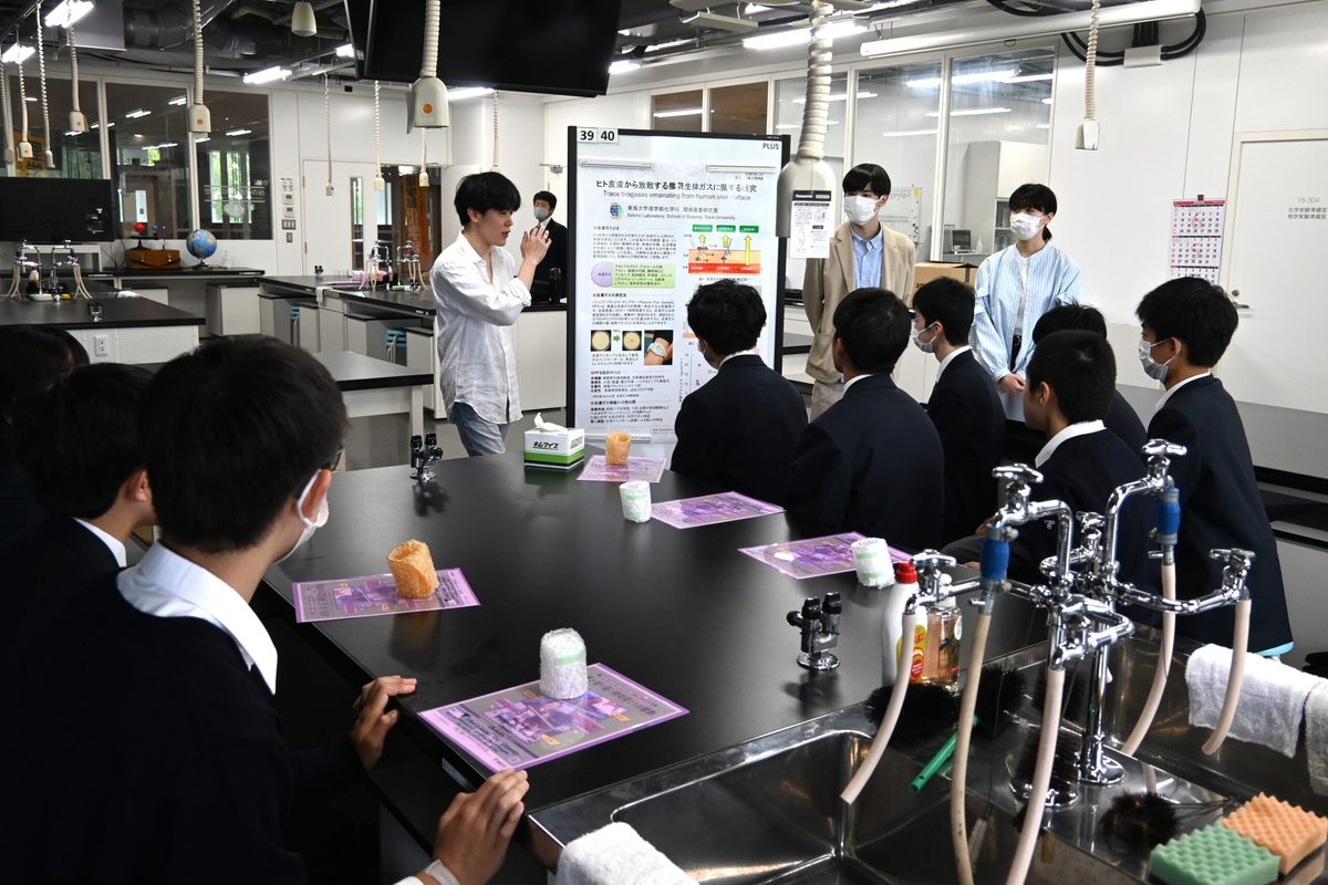 「物理学科紹介」では、物理学科の北林照幸教授が物理実験室で実験を実演。レーザーや音波の共鳴、原子などさまざまな分野の装置を前に「音の変化が面白い」「光がとてもきれい」などそれぞれに話し合い、北林教授の話を聞いて熱心にメモを取る姿も見られました。地学実験室では、化学科の冨田恒之教授と関根嘉香教授の研究室がそれぞれの研究テーマについて簡単な実験を交えながら紹介。冨田教授は紫外線と赤外線の原理を解説し、スマートフォンに用いられるレーザーを使った距離の計測技術や、赤外線による紙幣の偽造防止技術を観察する実験などを行いました。また、関根教授の研究室に所属する大学院生らが、人の皮膚から空気中に放散される微量の生体ガス「皮膚ガス」について解説。関根教授が企業と共同開発した皮膚ガスの測定デバイスを生徒たちが実際に装着したほか、普段のキャンパスライフや高校生活について語り合う場面も見られました。物理学科の研究室がある5階では、櫛田淳子教授が宇宙線物理学について講義し、天体観測など現地調査の様子や医療分野との連携事例などを紹介しました。