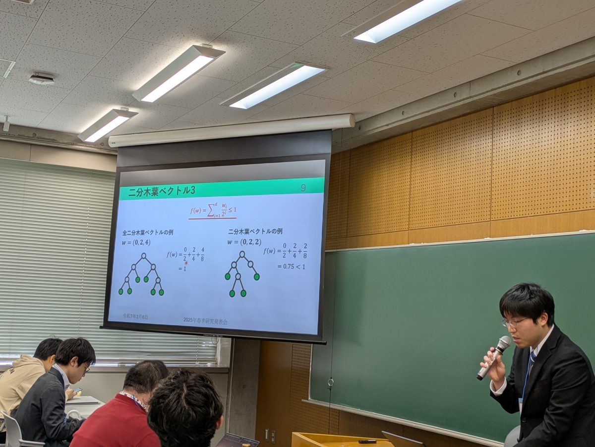 2025年3月6日,数理科学専攻・情報数理学コース修士2年生の,山田幸翼さんと吉田謙さんが,成蹊大学にて開催された「日本オペレーションズ・リサーチ学会」で修士論文の結果を発表しました.講演題目は,山田さんは「木の最小コスト辺彩色の列挙」,吉田さんは「葉数制約のある二分木の列挙アルゴリズムの実装と考察」です.