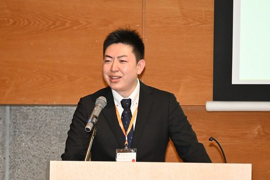 続いて、関根教授と共同研究に取り組む企業や本学医学部の教員らによる講演を実施。本学からは、大学院理学研究科2年次生の大坂智実さんと、医学部医学科内科学系消火器内科学の森町将司助教が登壇しました。大坂さんは、株式会社コーセー研究所スキンケア製品研究室香料グループの社員と共に、「睡眠の質が影響を及ぼすヒト皮膚ガス成分について(続報)」と題して、起床後30分以内に対象者から採取した皮膚ガスの検出結果などから、「よく眠れたと感じない」「寝つきと睡眠状態の維持が悪い」と回答した被験者に共通するガスの成分を調査した結果を報告しました。森町助教は、「皮膚ガス分析を用いた新規膵臓がん診断法の開発」をテーマに講演。初期段階での発見が難しく、根治できる方法が手術のみである膵臓がんの早期発見につなげる方法として、皮膚ガスの分析技術を活用し安価で誰でも受けられる非侵襲的診断法の開発に取り組む研究を紹介しました。医学部付属病院での臨床研究を踏まえ、「健常者と膵臓がん患者では検出されるガスのパターンが異なることが分かりました。今後は症例数を増やし、関根教授や関連企業にご協力いただきながら患者さんに負担をかけない新たな検査方法を開発したい」と語りました。講演の合間にはポスターセッションや企業プレゼンテーションが行われ、参加した研究者や企業関係者、学生らが活発に議論を展開しました。