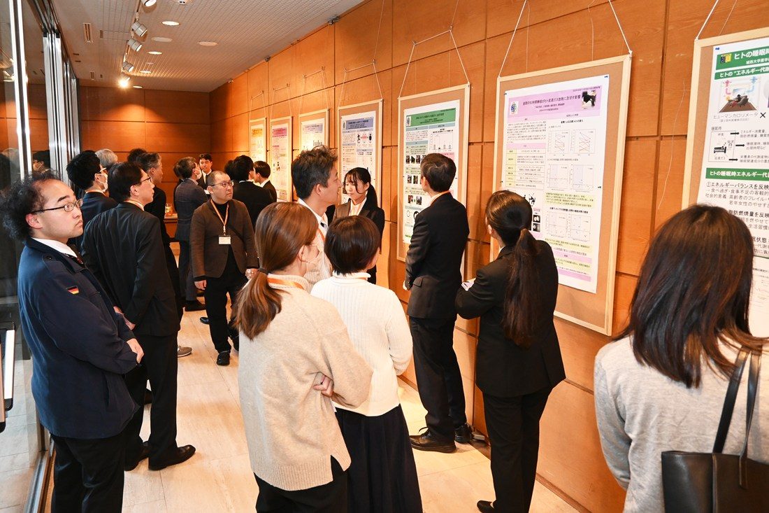 続いて、関根教授と共同研究に取り組む企業や本学医学部の教員らによる講演を実施。本学からは、大学院理学研究科2年次生の大坂智実さんと、医学部医学科内科学系消火器内科学の森町将司助教が登壇しました。大坂さんは、株式会社コーセー研究所スキンケア製品研究室香料グループの社員と共に、「睡眠の質が影響を及ぼすヒト皮膚ガス成分について(続報)」と題して、起床後30分以内に対象者から採取した皮膚ガスの検出結果などから、「よく眠れたと感じない」「寝つきと睡眠状態の維持が悪い」と回答した被験者に共通するガスの成分を調査した結果を報告しました。森町助教は、「皮膚ガス分析を用いた新規膵臓がん診断法の開発」をテーマに講演。初期段階での発見が難しく、根治できる方法が手術のみである膵臓がんの早期発見につなげる方法として、皮膚ガスの分析技術を活用し安価で誰でも受けられる非侵襲的診断法の開発に取り組む研究を紹介しました。医学部付属病院での臨床研究を踏まえ、「健常者と膵臓がん患者では検出されるガスのパターンが異なることが分かりました。今後は症例数を増やし、関根教授や関連企業にご協力いただきながら患者さんに負担をかけない新たな検査方法を開発したい」と語りました。講演の合間にはポスターセッションや企業プレゼンテーションが行われ、参加した研究者や企業関係者、学生らが活発に議論を展開しました。