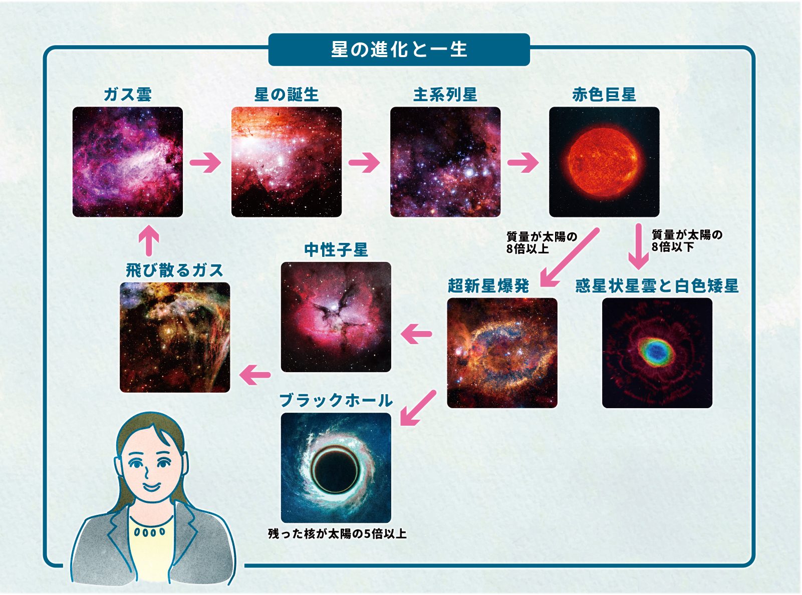 生物に寿命があるように、星にも寿命があります。生物と違うのは、その質量によって迎える最後が変わる、ということです。太陽の質量8倍未満では星の中心核以外が周りで惑星状星雲(ガス雲)になり、中心核は熱が冷え切るまで輝き続ける白色矮星になります。一方で質量8倍以上の星では中心核もろとも破裂する超新星爆発が起こります。