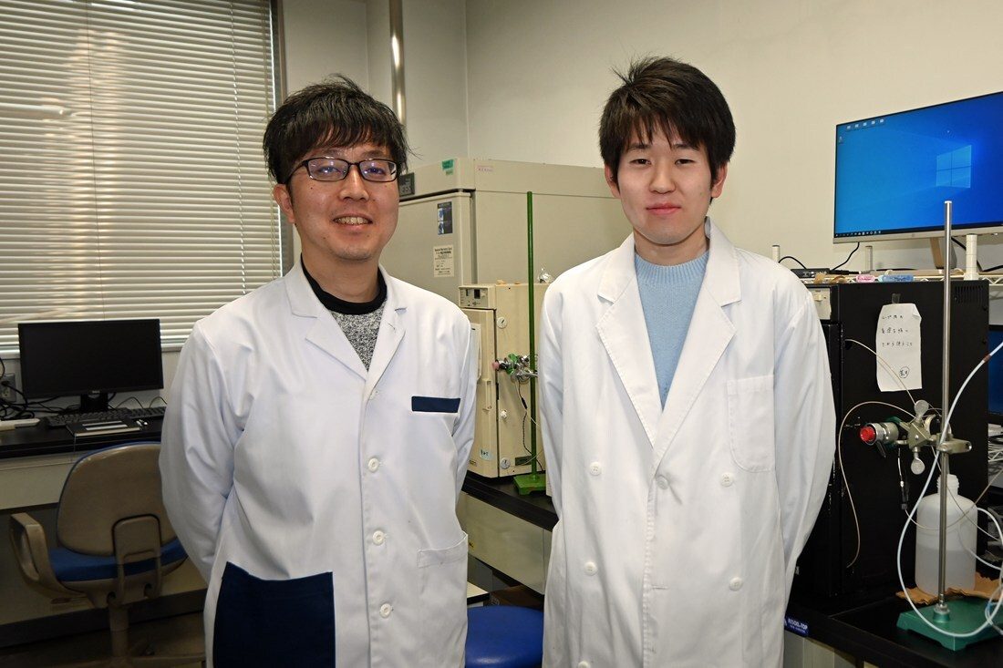 荒井准教授は、「両研究共に、権威ある学術誌に掲載されたことをとてもうれしく思います。研究過程では狙った分子の合成がうまくいかなかったり、生成した材料のパフォーマンスにムラがあったりと苦労もありましたが、大学院生たちが地道な努力を続けてくれたことが今回の成果につながったと感じています。人工材料の研究では、マイクロ・ナノ開発センターの岡村陽介教授(工学部)にもご協力いただくなど、横断的な研究体制で取り組んできました。今後はマテリアルの形状最適化などに取り組み、薬剤の製造に役立つ技術として社会実装を目指します」と話しました。