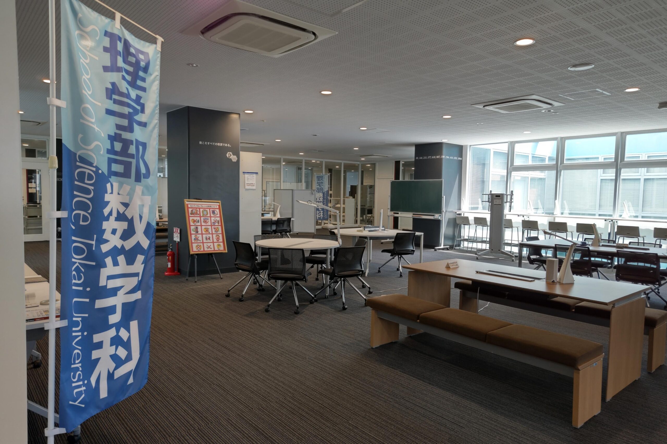 数学科の教授たちの研究室やゼミ室は、湘南キャンパス内の緑豊かな南東地域にある18号館8階にあります。新入生の皆さんもユニバーサル・プレートと呼ばれるスペースで自由に勉強したり、インターネットを使ったり、友達と意見交換したりすること可能です。充実した学生生活が待っています。