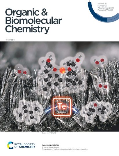9月7日にRoyal Society of Chemistry(英国王立化学会)が発行する国際学術論文誌『Organic & Biomolecular Chemistry』(Q1ジャーナル)に、澁谷優我さん(大学院総合理工学研究科博士課程3年次生)と大村詩織さん(大学院理学研究科化学専攻修士2年次生)、伊藤朱音さん(同専攻2022年卒)、大場真教授(工学部生物工学科)、小口真一准教授(理学部化学科)が発表した論文『Epoxidation of olefins using diaryltellurium dicarboxylates(ジアリールテルリウムジカルボキシラートを用いたオレフィンのエポキシ化)』に関する図表が表紙を飾りました。