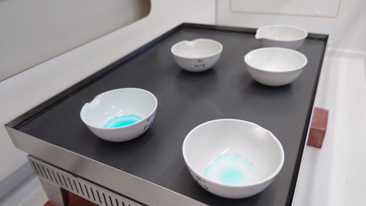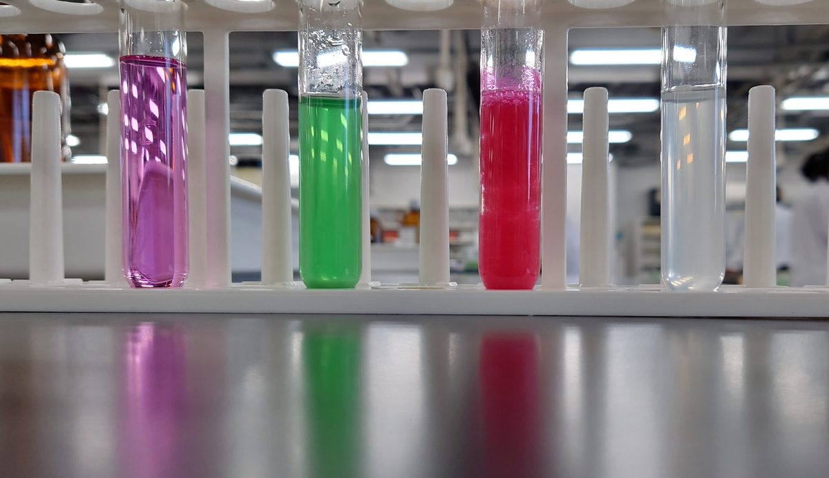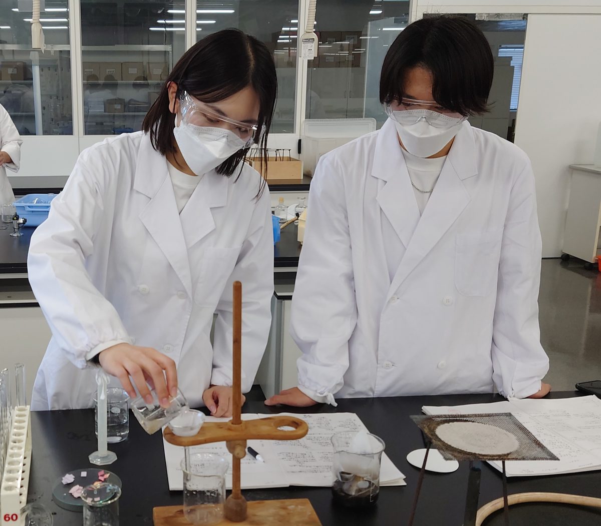 化学実験では金属イオンの分析を行う回があり、実験器具・薬品の取り扱い、様々な金属イオンの分析に挑んでいます!