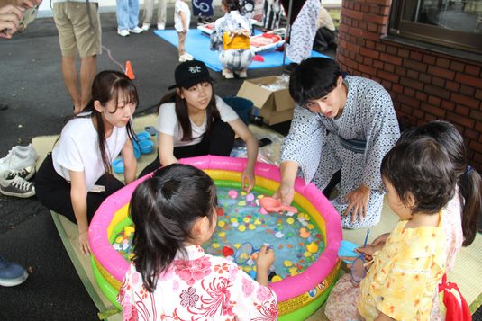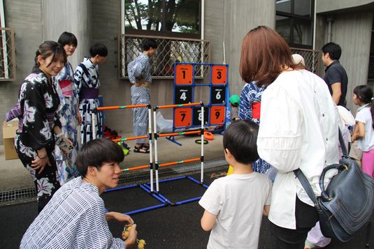 本キャンパス前の東海大学通りには、あちらこちらに学生たちが作ったポスターが貼られ、正門内広場に面した1号館には「富二夏祭り」と書かれた大きな横断幕が掲げられました。祭りは2部構成で、前半は正門内広場でさまざまなイベントや地域住民によるキッズチアダンスやコーラス、フラダンスなどが披露され、学生たちはスーパーボールすくいや的当て、ビーンバッグを投げる的入といった子ども遊びの運営を担当。順番を待つ親子連れが長蛇の列をつくり、広場には子どもたちと学生らの歓声が響きました。町会の渡邊貴司会長は、「渋谷キャンパスは町会エリアの中心にあり、町会草創期から長いつながりがあります。観光学部の学生さんたちは地域とのつながりを大事にしてくれて、私たちは元気をもらっています」と話しました。