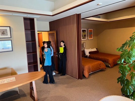 2日目は、施設内の宿泊施設で管理部の樫村良一さんから説明を受け、チェックアウトから次のチェックインまでの短い時間の中で円滑に業務をこなす様子を見学。同施設が15年と18年に日本と太平洋諸島の首脳が一堂に会する外交イベント「太平洋・島サミット」の会場となったことや、18年に福島県相馬市で開催された植樹祭に参加するために訪問した天皇、皇后両陛下(現・上皇ご夫妻)が宿泊された際の様子について、実際の会場や宿泊部屋を見学して説明を受けました。
