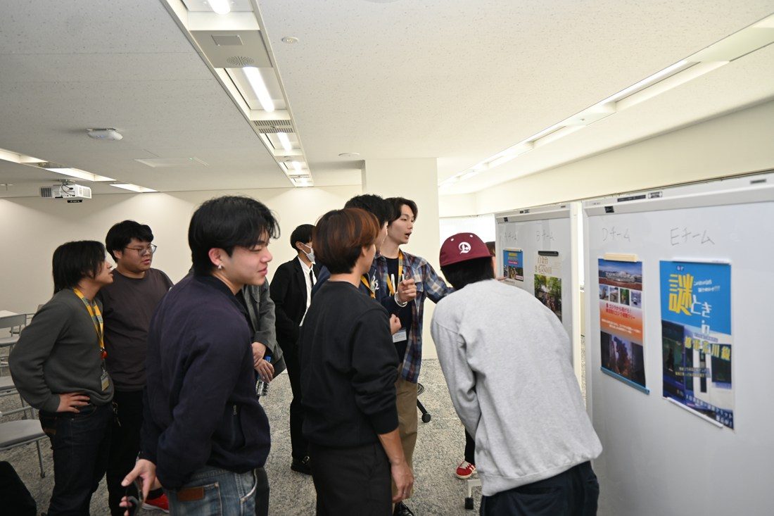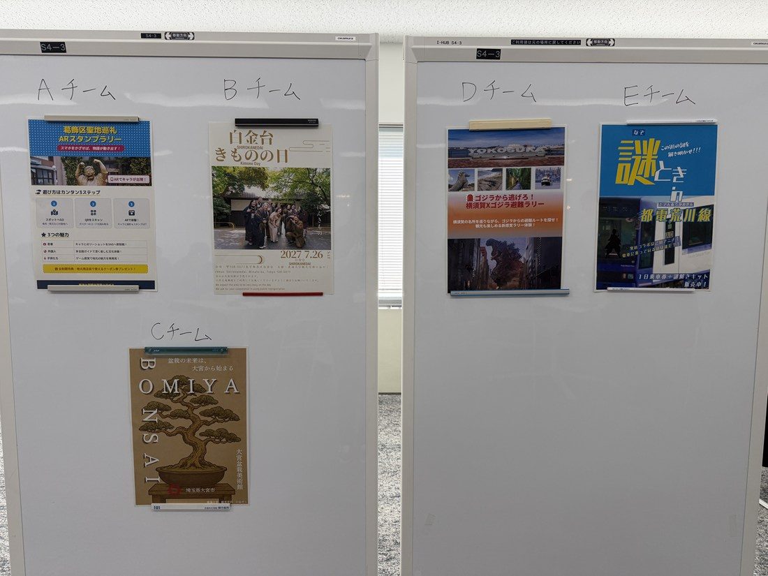 チームCは「大宮魅力UP大作戦」と題して、来街者は多いものの観光への意識が低い地域課題について、盆栽や神社といった魅力を掘り下げ、発信することで好循環を生み出すアイデアを発表しました。チームDは、「横須賀市 地域資本を活かす『ゴジラ×防災×観光』提案」についてプレゼン。人口減少と高齢化といった地域課題へのアプローチとして防災と観光、ゴジラと浦賀、商店街と非常食などの資本を掛け合わせ、映画の『ゴジラ』来襲を災害として想定した避難訓練や商店街による非常食アレンジ企画などユニークな提案を繰り広げました。最後にチームEが、「謎解きin都電荒川線 この街の謎を解き明かせ!」をテーマに発表。都電荒川線(東京さくらトラム)の概要を説明し、謎解きイベントに沿線の見どころを生かして非日常を体験できる仕掛けを提案しました。