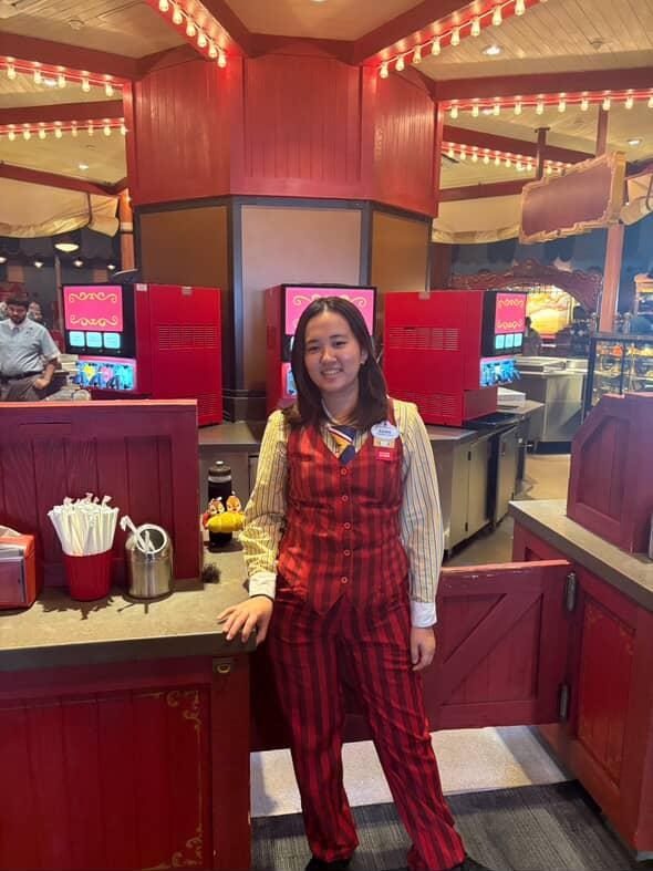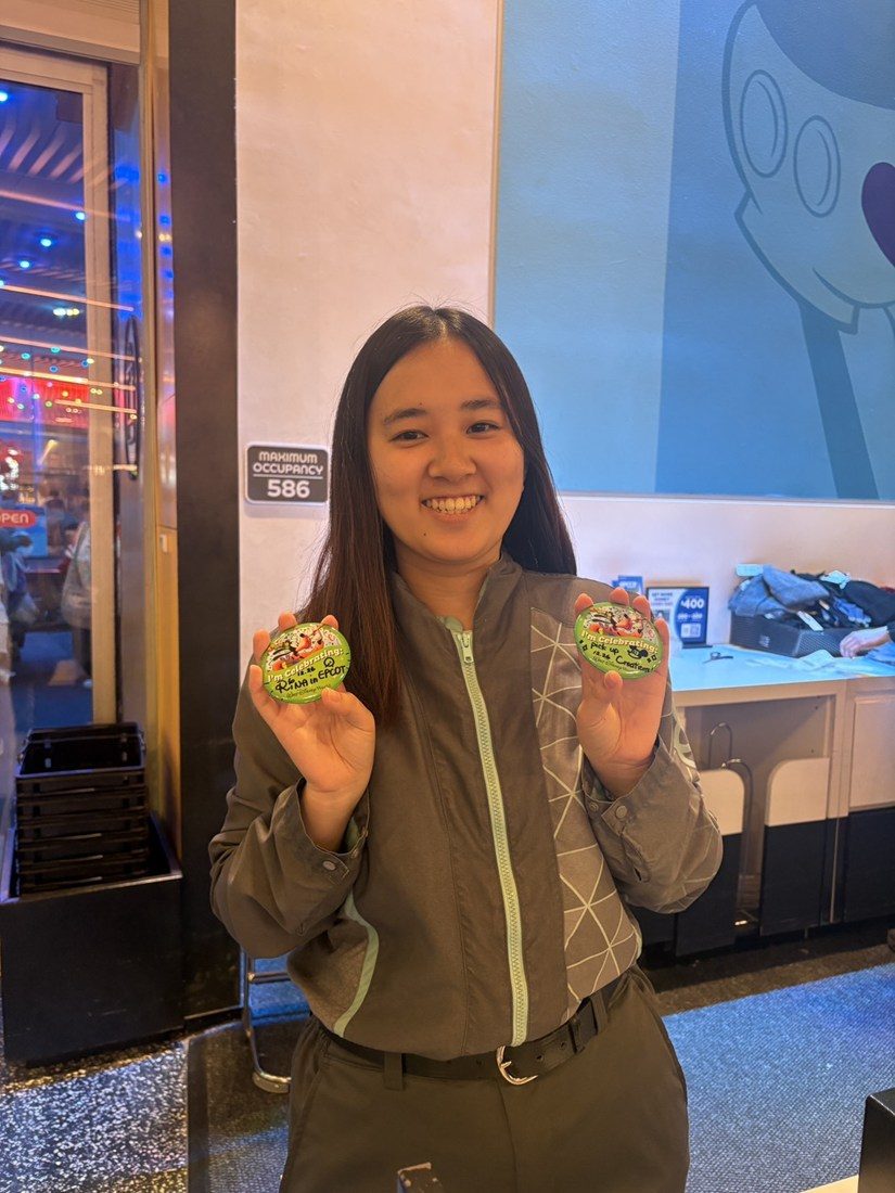 UCRの講義について、「サステナビリティ、環境、多様性といったテーマを踏まえた観光のあり方を学び、新たな視点を獲得できました」と手応えを語り、ウォルト・ディズニー・ワールド・リゾートの実習については、「最初に飲食店で研修し、短期間であらゆる現場の仕事を学びました。飲食店での接客は初めての経験だったので、当初は立ち仕事と途切れない接客にとまどいました」と話しました。「モバイルオーダーの窓口も一人で担当し、ピーク時にゲストの列が長くなり焦っていたら、ある女性ゲストから“あなた、とても頑張っているわね”と可愛いシールをいただき、涙がこぼれてしまいました」と振り返ります。「自身がリラックスしてハッピーであることが、ゲストの満足に直結すると再認識しました。以降は、気張りすぎず、まじめに前向きにと心掛けました」と語りました。