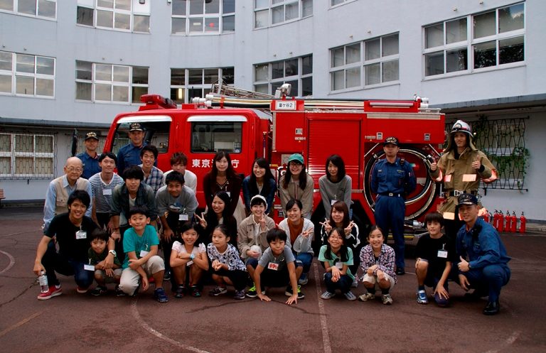 初日の開講式では、渋谷区上原地区体育会代表の松岡慶樹さんが、「みんなで楽しく仲良く、けがをしないように防災意識を高めましょう」とあいさつしました。次に、観光学部の遠藤晃弘講師が、東日本大地震の津波で大きな被害を受けた大川小学校(宮城県石巻市)を昨年学生とともに訪れ、現地で学んだことを写真などで紹介しながら今回の趣旨や注意点を説明。また、児童をマンツーマンでサポートする学生が自己紹介を行いました。続いて、東京消防庁渋谷消防署富ヶ谷出張所の協力で、防災対策についてアニメやクイズで学んだほか、実技訓練としてAED装置の使い方や心臓マッサージ、消火訓練を行い、最後に消防車を見学しました。